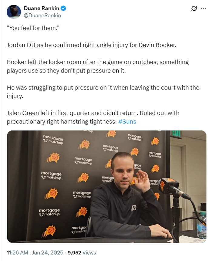 赛后太阳主帅乔丹-奥特谈到布克的伤势:我们都为他感到难过,他在比赛结束后是拄拐离开更衣室,球员通道通常都会准备这种拐杖以免让运动员受伤的脚再度负重。